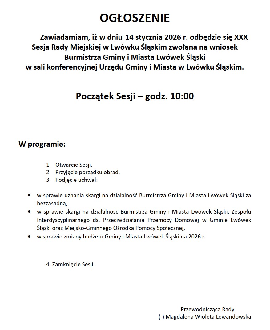 Zawiadamiam, iż w dniu 14 stycznia 2026 r. odbędzie się XXX Sesja Rady Miejskiej w Lwówku Śląskim zwołana na wniosek Burmistrza Gminy i Miasta Lwówek Śląski